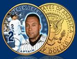 Derek Jeter US half dollar gold coin™. Now, you can share a part of American baseball history. And with who better than Derek Jeter? As the nine time All Star and Yankee Team Captain, Derek Jeter stands out as the only player to win both the All Star MVP and Series MVP awards in the same year. That is breaking ground in the nth degree. What's more, in 2009 Derek Jeter found himself being in the same league as other baseball history greats--Babe Ruth, Lou Gehrig, and Mickey Mantle--by scoring over 1,500 runs. That is American baseball history indeed, and this collectible, the baseball coin mint that has been made in honor of Derek Jeter, commemorates America's most recent baseball great in fitting style. You can have his image on a genuine US half dollar, and layered in pure 24 K gold. This limited edition Derek Jeter captain coin will also include a clear, detailed portrait of him, and his authentic, reproduced autograph. The Derek Jeter Coin is officially licensed as the 2009 season coin, and with it comes an official baseball coin mint certificate of authenticity. Indeed, Yankee fans and lovers of baseball history will be delighted to have a Captain genuine uncirculated US half dollar coin of Derek Jeter. Get yours while they are still in stock.