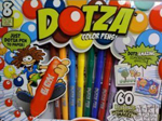 Dotza™ colored pens are markers, pens and inspiration all wrapped up into one. The Dotza pens give kids the gift of pizzaz by allowing them to produce creative and two dimensional pictures from their very own imagination. Not only do the Dotza pens work as a regular marker they also have the truly uniqie ability to create eye popping dots which children can use to draw their masterpiece. Drawers both young and old can use these colorful markers and the possibilities of creation are endless. They can use the enclosed picture book and trace around the lines or draw something totally their own; either way they are helping to develop the cognizant skills they need to do well in school and life. When Dotza pens are introduced there isn't a child around who can resist the cool colors that will suddenly surround them. In case that's not enough Dotza pens come with Dotza paints! Best of all, all the products are fully washable and non-staining and the perfect anecdote for those "I'm bored" days of summer vacation.