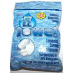 EZ Towel™ is compact in size. It's just like having five stacked nickels in its normal form. Just add water and you can watch this towel grow. Simply unroll these towels and you can use it the way you want to. When it has been opened up it becomes a full sized towel measuring 8 1/2 x 9 1/2 inches Each bag contains fifty towels. The wonderful aspect of EZ Towels is that they are sturdy, soft and absorbable. They are much better than paper towels. This product is made of one hundred percent rayon and it can do the job of ten napkins. It's bio-degradable. The EZTowel can well be appreciated for its use in homes, office, restaurants, daycare centers, and camping trips. These outstanding towels can be used in work areas. EZ Towels are very sturdy and are full sized towels made of one hundred percent rayon. EZ tablets are packed in convenient tablet size and this what makes it easy to keep and carry. Each bag of EZ Towels contains fifty towels that are well packed in a zip lock bag. Just open the bag, remove the towel and start using it. Always reseal the bag to keep it tightly secured. Try the