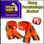 Forearm Forklift™, the revolutionary new way to carry heavy loads when moving or rearranging furniture at home, or even at the job site! Forearm Forklift replaces dollies and other clumsy moving devices that ding and dent your home and appliances with safe and efficient support. The secret to Forarm Forklift is in the power of your own forearms - they can safely support many times more weight than your hands and fingers. Using Forearm Forklift is a breeze - simply put the lifting straps under the item you need to move, cross them, insert your forearms in the lifting straps loops and lift. Forearm Forklift automatically forces your body to use the proper lifting technique and leverage for safe and easy lifting and moving. "Medically speaking, I would use Forearm Forklift because it's a safe device," says George Washington University graduate Dr. Raquel Sandford. "I would prefer my husband to lift furnishings with Forearm Forklift to protect his back." Builder Bruce Stevens says he uses them on work sites: "As a builder, moving things like bathtubs and drywall, I can't think of anything easier to use. And it lasts a long time!" Just one use and you'll see why over one million Forarm Forklifts have already sold - they're the safest and easiest way to move and maneuver large, heavy, and bulky items at home and at work. Also available with ForearmForklifts is a 3.5 foot extension for lifting and moving oversized items and Grip Gloves.