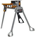Jawhorse®, the revolutionary new workbench system by Rockwell that lets you do the work of two by yourself. With the Jawhorse, you'll never again need help setting fence posts, hanging doors, installing crown molding or leveling and mounting chair rail. You can even hang sheet rock with the Jawhorse! The secret to the Jawhorse system is in its high-tech engineering - the solid steel frame and one ton ratcheting clamp, combined with the fact that the Jawhorse has no easily-broken moving plastic parts, mean the Jawhorse is one of the strongest and stable portable workbench systems you'll ever use. It's easy to use, too - simply set it, lock it and clamp it. The Jawhorse gives you the freedom to work alone and saves time and money. Use it as a saw bench for miter saws, table saws and tile saws; as a vice for working with metal pipes and other difficult materials; to keep engine blocks secure; and to keep your materials stable and safe when working with power tools. And because the Rockwell Jawhorse folds up to neatly fit in a small closet, you can take it anywhere - on the job site, in the driveway, in the garage and even in your home or apartment. Unlike sawhorses that wobble and tip, the Jawhorse's extra-wide stance keeps it stable almost anywhere. And because it replaces a whole slew of saw stands, clamps, jigs and even an entire person, the Jawhorse will save you time, hassle and money every time you use it. The clamp opens to an amazing 37 inches and keeps your delicate projects neat and dent-free with its patented rubber grips; and the optional clamp extender lets you securely clamp plywood up to 48 inches. And if you're a welder, the optional welding attachment puts everything you need within reach and extremely stable for extraordinary precision - all with the Jawhorse. Whether you're a contractor on the go or have a lot of projects around the home, the Jawhorse is an investment you'll never regret. Save time. Save hassle. Save money.