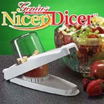 Nicer Dicer™, the quickest and easiest way to chop all your favorite vegetables for delicious meals. The Nicer Dicer chopper makes cutting bell peppers, French fries, tomatoes, celery, and all other veggies a cinch - simply load the Nicer Dicer container with your chosen food, attach it to the cutting tray and push! The Nicer Dicer's precision cutting blades instantly dice and slice the entire container contents so you're completely chopping whole vegetables in one quick motion. As seen on www.nicerdicer.com, NicerDicer is so fast, you'll never cry when chopping onions again. The as seen on TV reviews and www.nicerdicer.com don't lie - the Nicer Dicer makes preparing your favorite dishes faster and easier every time. Chop vegetables for salads, stews, garnish, side dishes, soups, and just about anything else in no time flat. Best of all, the Nicer Dicer cleans in seconds and you won't have leftover pieces all over your cutting board and counter tops. The Nicer Dicer's precision cutting blades are guaranteed to never dull, so try NicerDicer today and prepare your favorite recipes faster, easier, and cleaner for years to come.