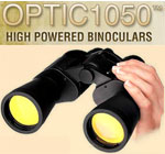 Optic1050™, the high power binoculars that prove there's always more than meets the eye. Optic1050 incorporates phenomenal 1000% magnification so you can clearly see objects up to a whopping 35 miles away. As seen on TV, these lightweight binoculars don't need to rely on opinions or customer reviews to prove their worth - the proof is in the power. Compare Optic 1050 to high-end binoculars from Swarovski, Nikon, Bushnell, Steiner, Leica, Or Leupold: With all the amenities of the most expensive thousand-dollar binoculars like soft rubber eye cups, eye width regulator, center focusing wheel and durable rubber body, Optic1050 is practically a steal at this price. Optic1050 is shatter-proof and shock-resistant so these binoculars are safe for the entire family - kids included - and can take a beating for years of durable dependability. Whether you like to rough it in the woods for hunting or just want to see the faces of your favorite sports stars, you can't go wrong with Optic1050. You'll also get a handsome Optic 1050 carrying case absolutely free. But that's not all you'll also get the amazing Spyscope - a miniature telescope that lets you see up to 7 miles away without being seen and doubles as a convenient reading magnifier. That's a $50 value - yours free. See what you've been missing.