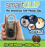 Smart Clip™. Smart Clip keeps your cell phone comfortably within reach through a revolutionary peel 'n stick loop that you simply apply to the back of your cell phone and hang on anything: your hand bag or purse, your briefcase handle, your belt loop, your gym bag, a child's diaper bag, backpack and more. SmartClip is strong - strong enough to hold up to 8 pounds - yet so comfortable you won't even know it's there. But when your cell phone rings, you'll be able to instantly find it! It won't constantly spin and the loop clips safe and secure so you don't have to worry about dropping your cell phone, even if you're in a hurry. Smart Clip also comes with a handy built-in LED light you can use to read, find your keys in your purse and to help you find your car in a dark parking lot. SmartClip is easily removable, too, and it also comes with a handy adhesive hook you can peel and stick to your car dashboard for hands-free highway cell phone conversations. Or, you can clear counter space by hanging your cell or mobile phone up to charge. Order now and you'll get double your order - that's two Smart Clips with built-in LED flashlights and two adhesive hooks (so you can put one on the wall and one on the dashboard) - for one low price.
