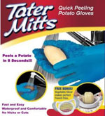 Tater Mitts™, the fast and safe way to peel potatoes in no time! Tater Mitts aren't your ordinary potato peeler - there's no slicing involved and no waste from taking out huge chunks of potato. Simply slide our patented Tater Mitts over your hands, grab a potato and work it between your palms under running water. The special peelers fitted on the glove palms quickly and easily peel away the thinnest layer of potato - with no waste - in just eight seconds flat. As seen on TV specials nationwide, Tater Mits from Emson blow traditional potato peeling out of the water for safety, convenience, ease-of-use and - best of all - speed! TaterMitts make it so you can whip up some mashed potatoes, make a batch of your famous potato salad, or even fry up some seasoned fries in less than a third of the time it would take with traditional peelers. Tater Mitts are great for peeling any kind of potato - even sweet potatoes. Also available are Perfect Fries, the one-cut French fry cutter. Take only one swipe at each potato and make perfect cuts with Perfect Fries. Stop wasting time with duds and start cooking splendid spuds with Tater Mitts.