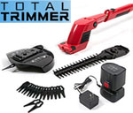 Total Trimmer™, the revolutionary new trimmer that makes gardening and yard work a breeze! Perfect for homeowners, seniors, landscaping companies and anyone else who wants to avoid the time consuming, backbreaking labor of lawn maintenance, the Total Trimmer from Global Ideas Direct is a lightweight yet powerful trimmer that harnesses the energy of a powerful 18-volt battery pack to snip, clip and trim your yard into shape. With the Total Trimmer, as seen on TV, you'll never again need hassle with the mess and expense of mixing gasoline and oil; you'll never again have to spend hundreds or even thousands on a professional landscaping crew; you'll never have to spend tedious hours changing sloppy nylon cords; and you'll never have to ice the pain of dragging a heavy gas trimmer around all weekend. Instead, the lightweight TotalTrimmer is cordless so you can go anywhere, and the amazing rotary trimmer blades simply snap on and off for quick and easy replacement. The Total Trimmer's head even swivels to go from trimmer to edge in a snap - this amazing functionality lets you power edge your driveways and sidewalks in no time. Try the Total Trimmer right now and you'll also get the Total Trimmer exclusive diamond-cut hedge trimmer attachment, perfect for conveniently shaping your bushes and shrubs, absolutely free! You'll also get the handy grass sheer attachment for cleaning up scrubby areas around fence posts and under bushes - couple these attachments with the Total Trimmer's telescoping pole and you'll never have to bend or reach to whip your launch into shape again. The TotalTrimmer also comes with a free lifetime supply of quick-change blades - if you ever damage your blades, simply order another set and they're yours free! You've seen the TotalTrimmer at work on the TV commercial/infomercial with Beau Rials and Mimi Umidon. What are you waiting for? Stop the backbreaking labor and enjoy the weekend again.