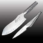 Zasshu Knife™, the amazing hybrid that combines the cutting edge of a metal aluminum knife, with the chopping power of a cleaver--plus the versatility of the chef's knife. Quite a hybrid. A review of the knife by Anthony Sullivan noted its perfect balance in cutting rounded edged vegetables. He said it also juliennes quickly and easily, and is a deft paring knife. The scalloped blade is stick and stain free, and with the rubber inside grip it's great to hold and won't slip. You may think, with the Zasshu knife, what more could you need? Even more likely, you already have a set of knives. Either way, the Zasshu Knife makes a perfect addition to your current set of knives, and if you plan to go camping or mountain climbing, it may be the only knife you would bring with you. The Zasshu Knife is hardy and durable, and its Japanese steel is known for its strength, and its ability to stay sharp and hold its edge. As seen on the TV commercial with Anthony Sullivan, cutting is done with precision with no force or pressure required, even when cutting through thick skinned fruit like a melon, watermelon, and the like. Titanium adios, or titanium hello? Either way, it's Zasshu forever.